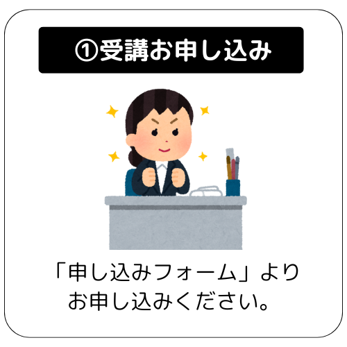 申し込みフォームよりお申し込みいただいたのち、指定口座に受講料+テキスト代をお振込みいただきます。入金確認後、その後の研修に向けた必要書類等を送付いたします。